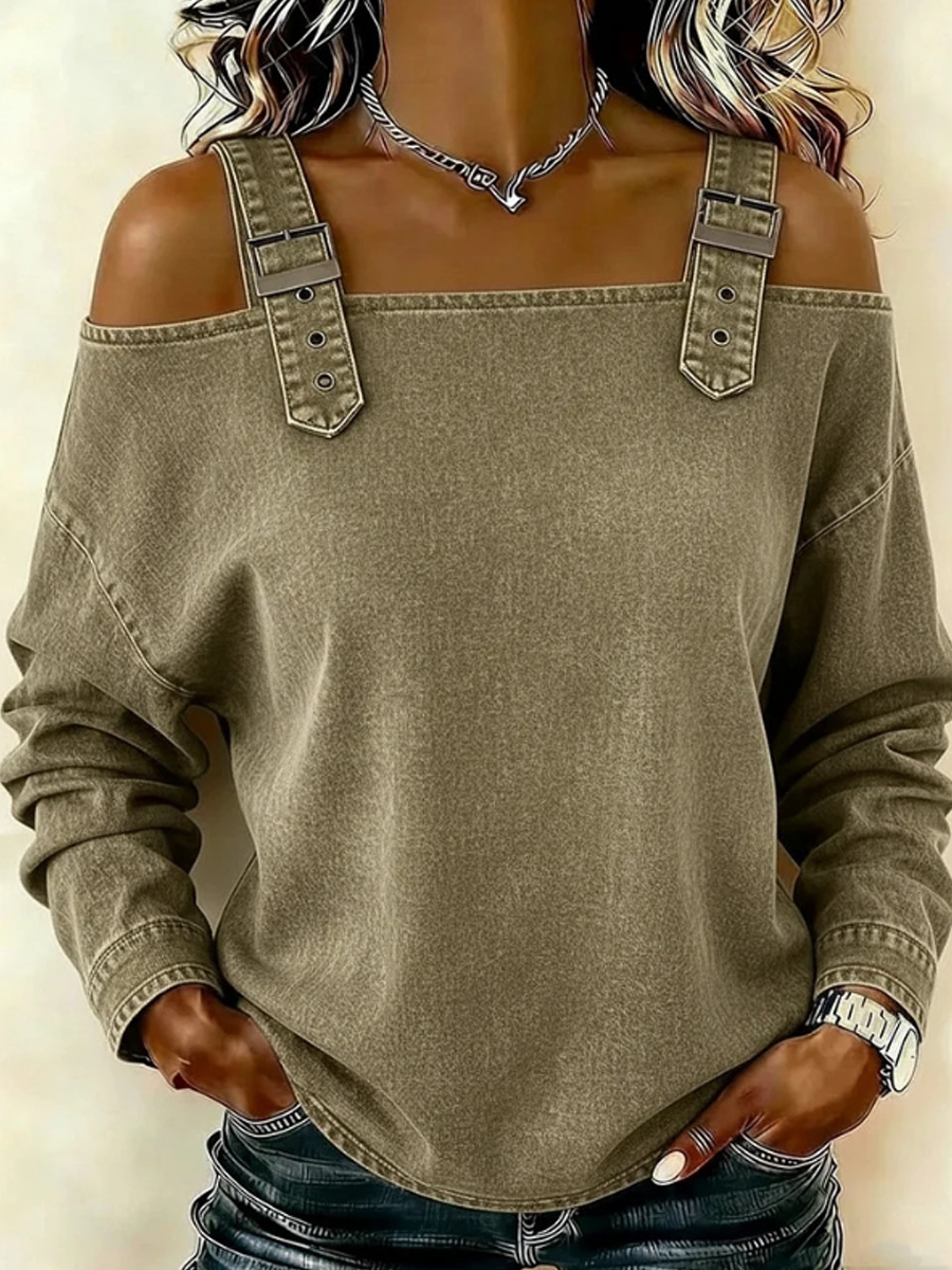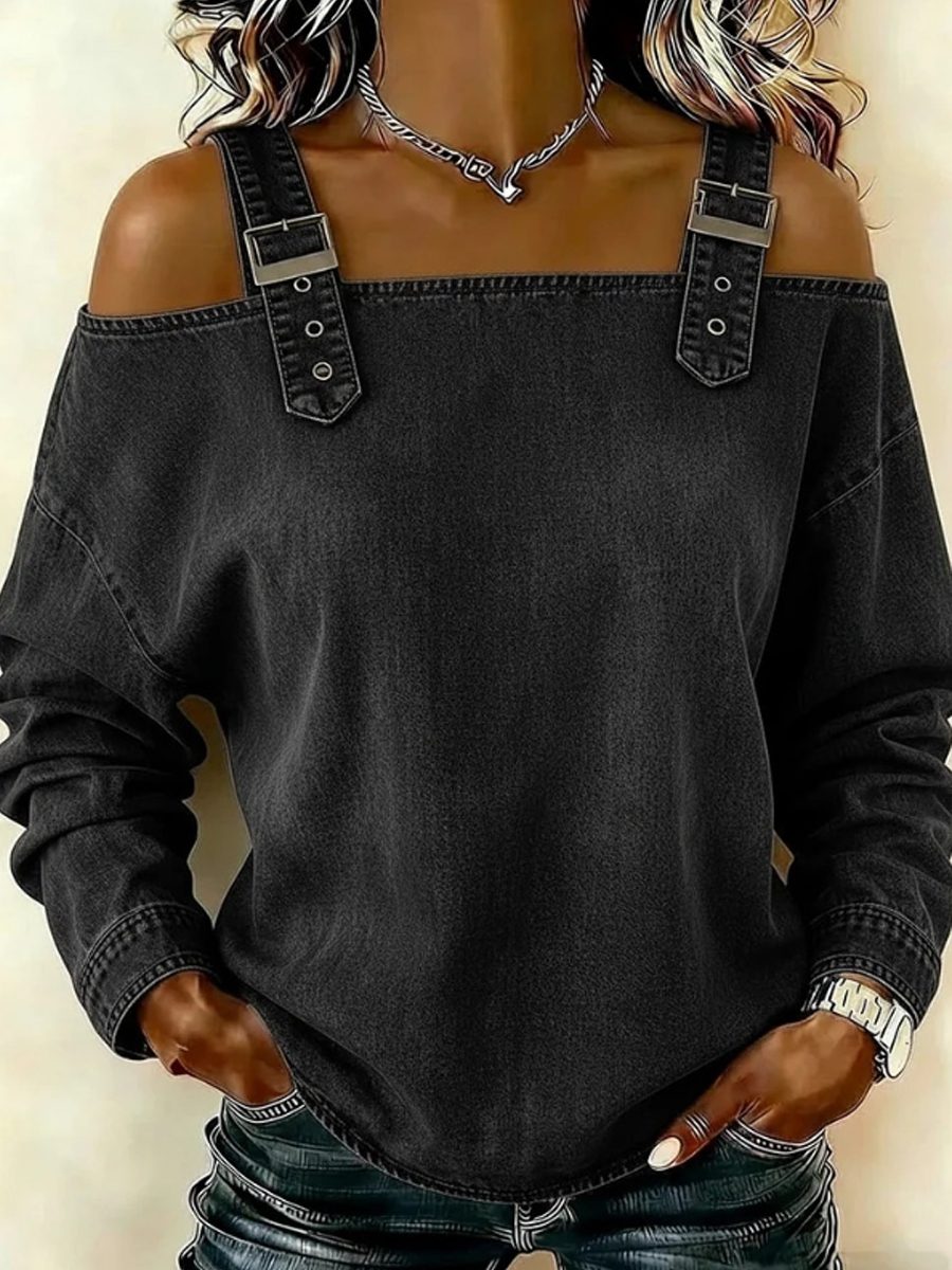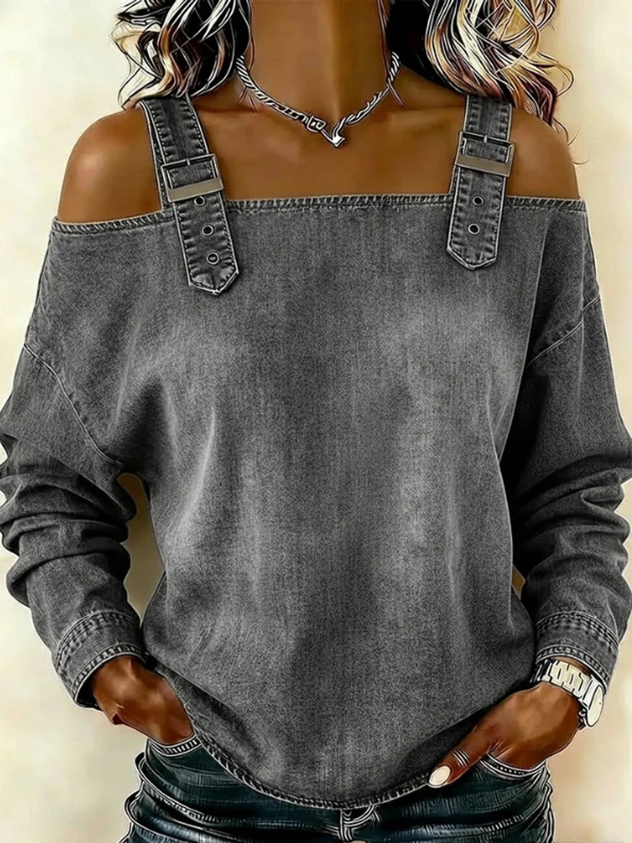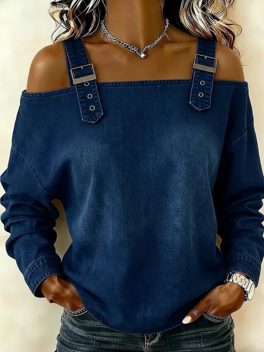 Women's off-the-shoulder long-sleeved denim top with shoulder straps